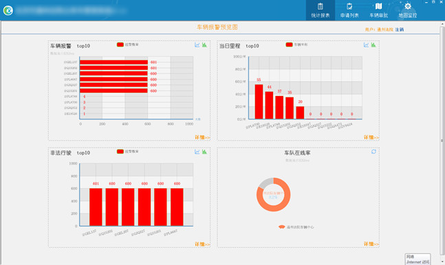 “车辆报表”, “当月里程”, “非法行驶”, “车队在线率”总体统计柱形图。如图3