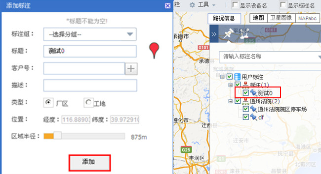 在添加标注弹出框中,输入标题, 选择好区域半径,点击“添加”如图12