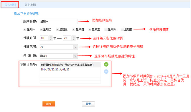 填写规则名称 —> 选择每周上班周期 —> 选择每天行驶时间 —> 选择行驶范围(地图监控创建的围栏)—>选择停车场(地图监控创建的标注)—> 添加节假日时间,这个时间正好在行驶周期之内—> 点击添加,规则一创建成功。如图15