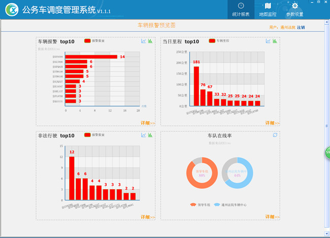 1.1 公务车调度管理系统页面介绍:统计报表、地图监控,参数设置。如图2
