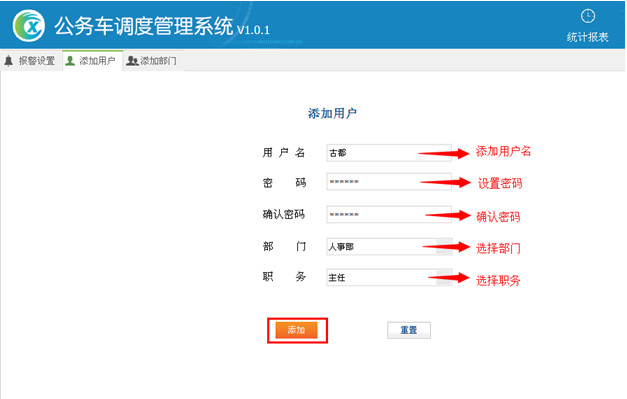 填写用户名—>设置密码—>确认密码—>选择部门—>选择职务(职务是固定的)如图21