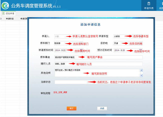 4.3 登录员工“小张”添加申请单子,申请车辆(某时候,使用那某辆车,去什么地方,干什么事情,和某某人去)等管理员审核通过之后就可以将车开走,车辆也不会非法报警。如图24