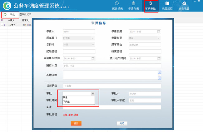 4.4 登录主任“小王”点击车辆审批 —> 双击申请单子 —> 显示页面 —> 在审批选择同意或不同意如图25